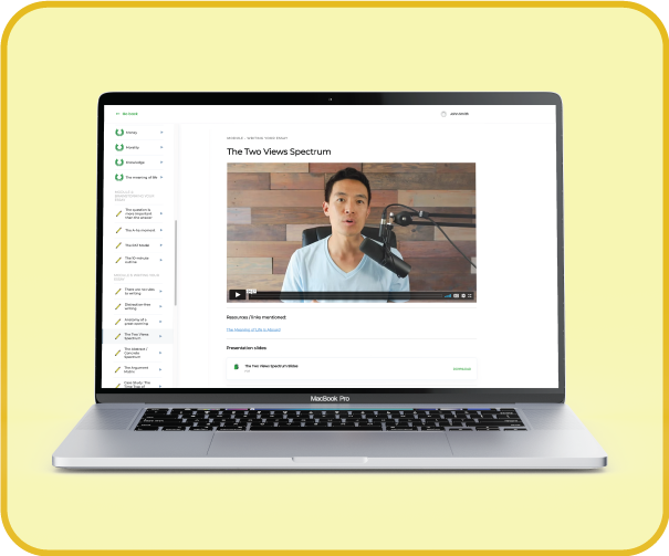 These are pre-recorded videos that act as an appendix to the main curriculum. They include brief how-to’s, such as an overview of Adobe Illustrator, a walkthrough of my writing software, and more. The Toolkit also includes additional examples of course frameworks to help cement your understanding of them.
