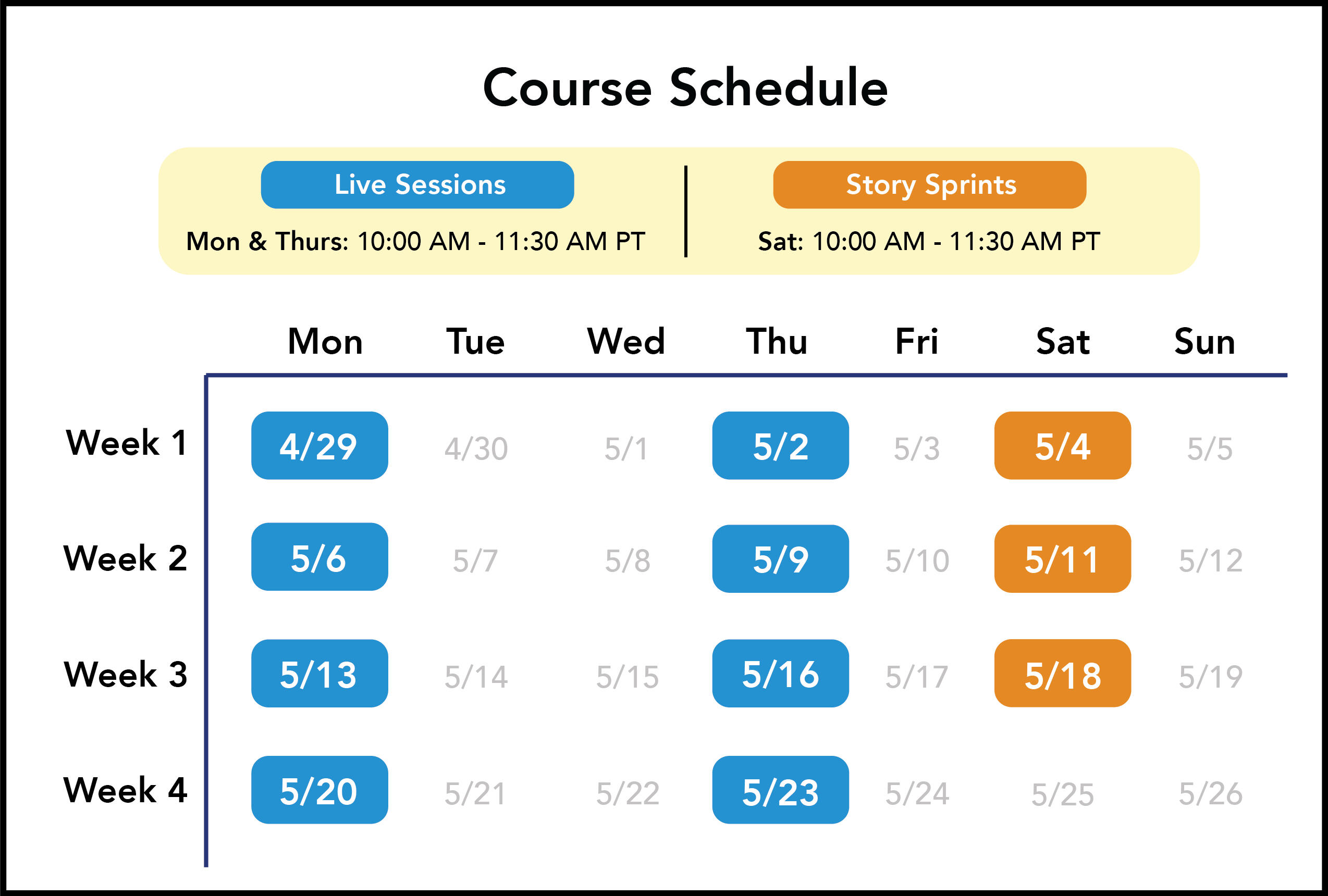 Learning is the marriage of theory and practice, and this guides the way I've structured Thinking In Stories.The live sessions on Mondays and Thursdays cover much of the theory behind storytelling, and I provide many, many original frameworks and concepts. So at a bare minimum, attending or reviewing these lessons will require 3 hours of your time each week.But the real learning happens when you put everything into practice.Every Saturday, there's a bonus Story Sprint session that lasts 90 minutes. It's designed to help you build a story from scratch using the Thinking In Stories method, and each one incorporates frameworks from that week's sessions. In addition to these, you can expect to add an extra 1-2 hours to work on your assignments for the week.So here's the quick breakdown:Minimum weekly commitment - 3 hours"I want to get the most out of this" weekly commitment - 6-7 hours