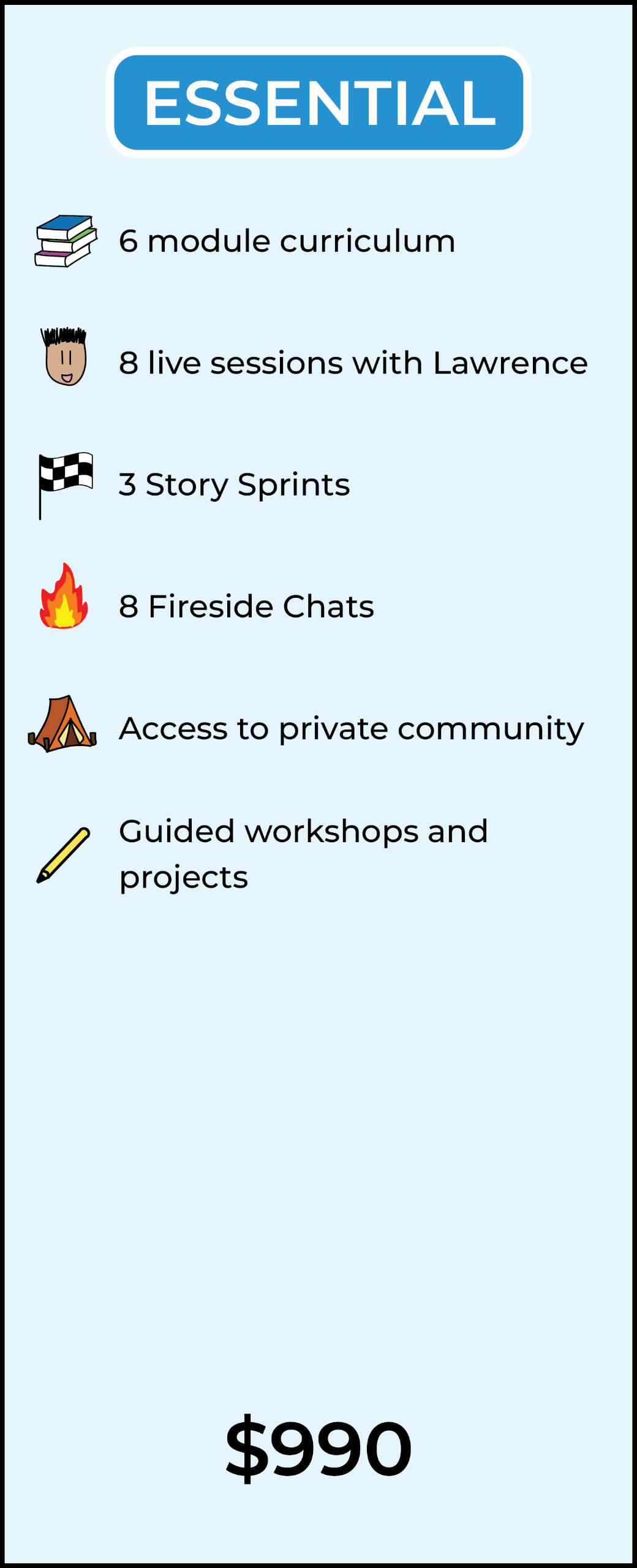 Thinking In Stories is not your typical course. The entire experience takes place in a world called the Story Campground, where every area serves a specific purpose for our 4 weeks together (here's a map of it).The Main Lodge is where we’ll meet together on Mondays and Thursdays. I’ll go over frameworks and strategies for each module, and will provide live exercises to help you bridge the gap between theory and application.